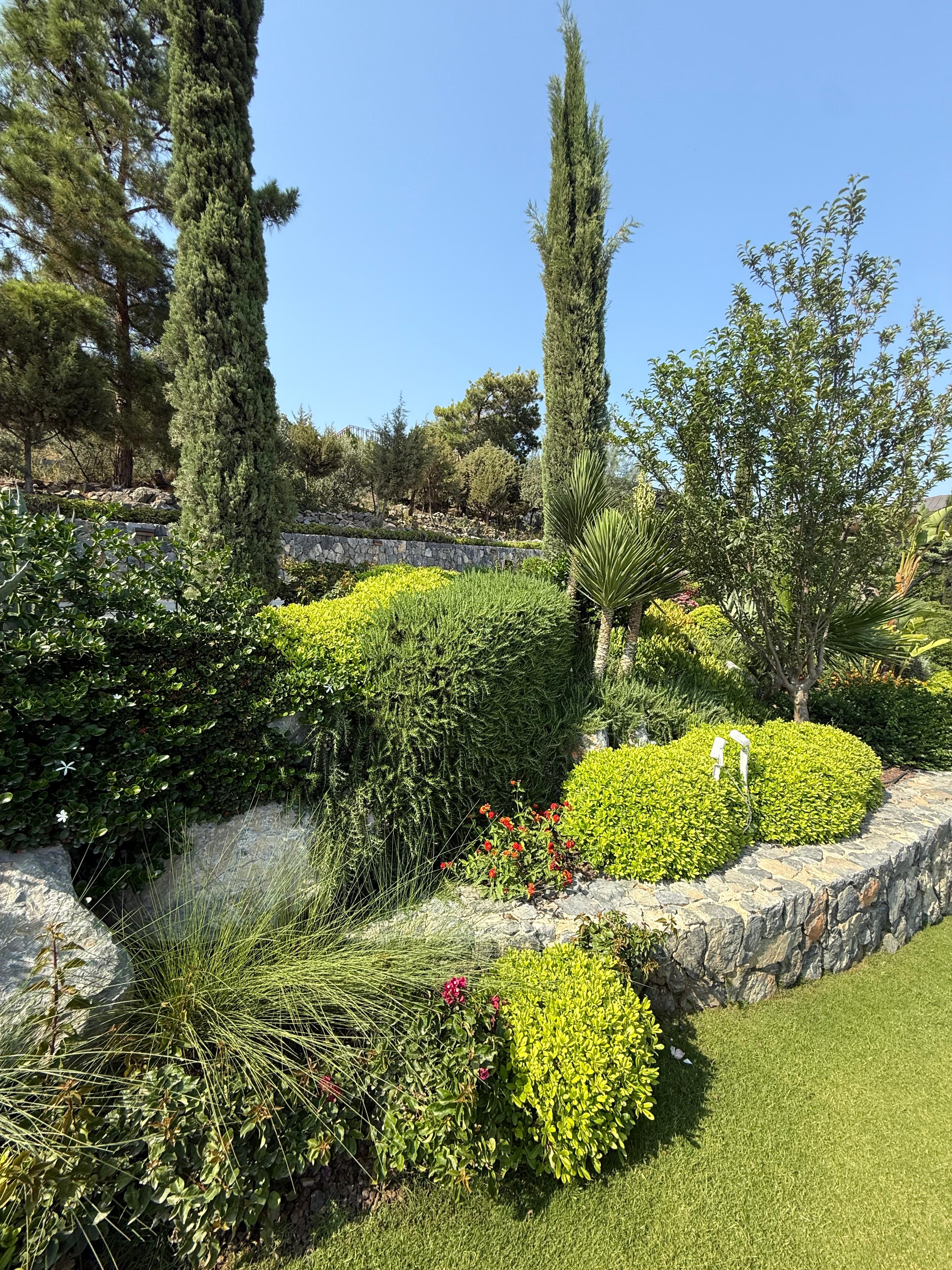 Bodrum Kaplankaya'da yer alan bu lüks villa projesi, modern mimari ile doğal peyzajın mükemmel bir uyumunu sunuyor. 1200 m² alana yayılan bahçe düzenlemesinde, bölgenin karakteristik bitki örtüsü korunarak estetik ve fonksiyonel bir yaşam alanı oluşturuldu.